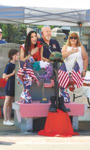 Mrs. West Virginia America 2022 Christina Fowler, second from left, leads the audience in the Pledge of Allegiance, with the help of her daughter Giuliana, 8, Saturday at the Stepping Stones of Honor ceremony in Parkersburg City Park. Also pictured are President of the Veterans Museum of the Mid-Ohio Valley Scot Heckert and April Binkney, secretary and treasurer of the museum. (Photo by James Dobbs)