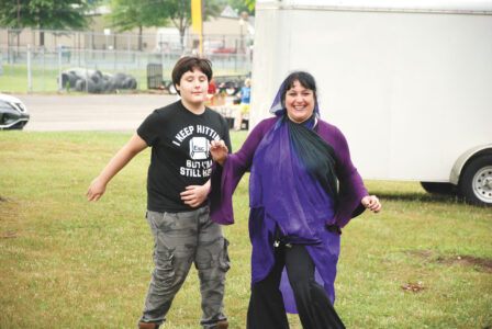 - Erica Lonas, right, with local belly dancing troupe Jewels of the Valley, does the Twist with her son, Jonuthin, during a performance and demonstration at the Humane Society of Parkersburg’s Walk Your Paws fundraiser in City Park. (Photo by Evan Bevins)