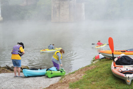 - Paddlefest participants float in the fog Saturday morning as they wait for others to head out to Blennerhassett Island. (Photo by Ashley Knight)