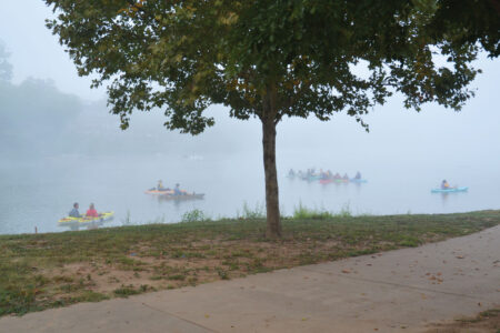 Paddlefest participants float in the fog Saturday morning as they wait for others to head out to Blennerhassett Island. (Photo by Ashley Knight)