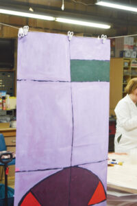 A piece of finished parachute paper is hung to dry Saturday at the Parkersburg Art Center. It’s one of multiple pieces of a mural designed by artist Nichole Westfall that community members were invited to paint Friday and Saturday. (Photo by Clara Noelle)