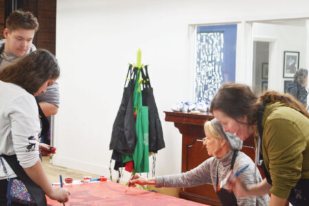 Family members paint a piece of parachute paper as part of a mural to be applied to the entrance to Point Park at the floodwall Saturday at the Parkersburg Art Center. (Photo by Clara Noelle)