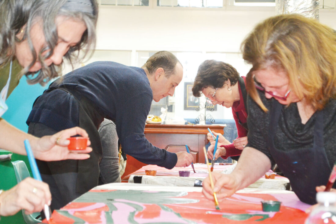 - Community members paint sections of a mural to be placed around the entrance to Point Park in the Parkersburg floodwall Saturday at the Parkersburg Art Center. (Photo by Clara Noelle)