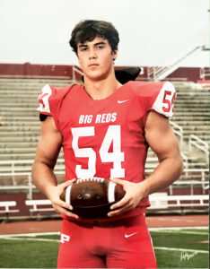 - Grant Snyder stands against a picture of him (54) from the Big Reds versus Cabell Midland game last year. (Photo Provided)