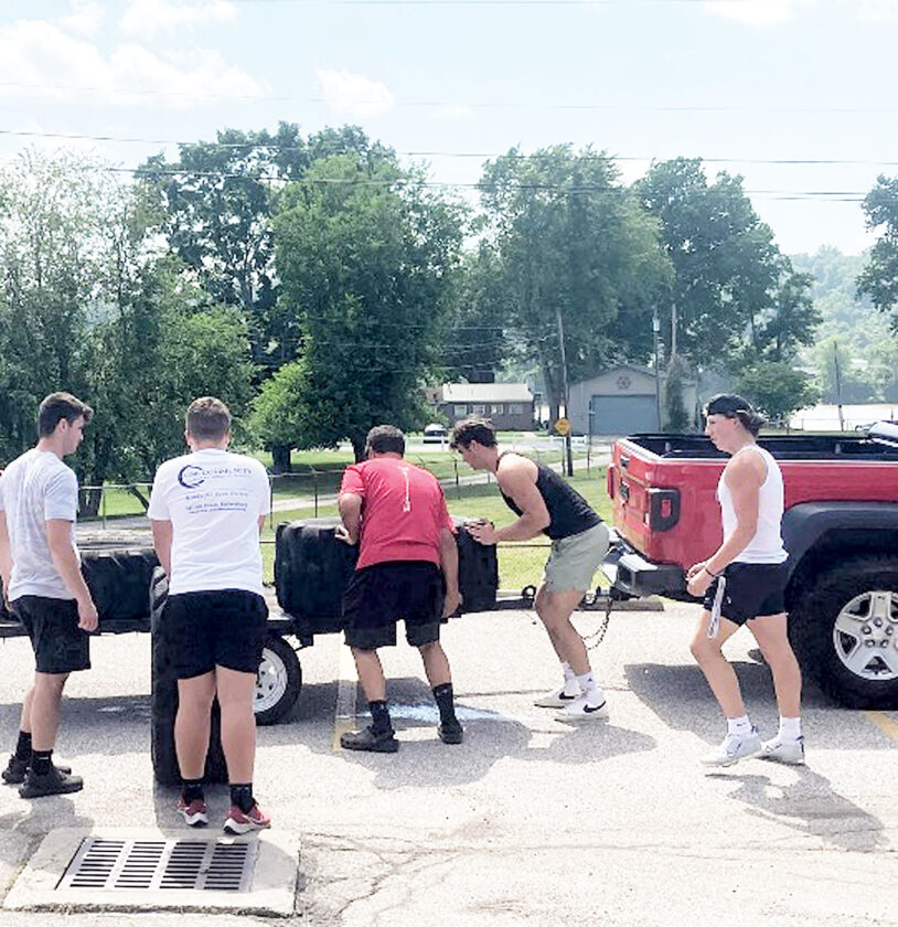 - Grant Snyder, second from the right, volunteers with his fellow football players to move tires for Custom Fitness of Vienna. (Photo Provided)