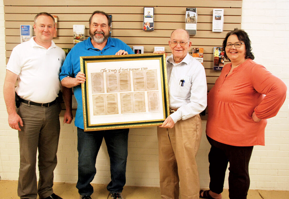 - From left, Marietta Mayor Josh Schlicher; Bruce Wunderlich, creative director for the Washington County Convention and Visitors Bureau; Marietta resident Meredith Potts; and CVB Executive Director Deana Clark pose for a picture with a copy of the 1789 Treaty of Fort Harmar donated by Potts to the city and the CVB Wednesday at the bureau’s location in the Armory. (Photo by Evan Bevins)
