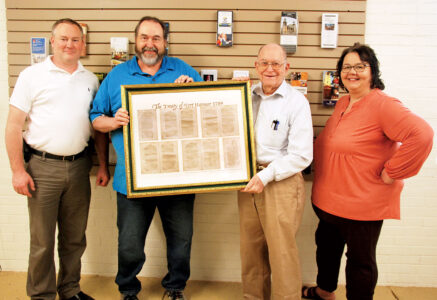 From left, Marietta Mayor Josh Schlicher; Bruce Wunderlich, creative director for the Washington County Convention and Visitors Bureau; Marietta resident Meredith Potts; and CVB Executive Director Deana Clark pose for a picture with a copy of the 1789 Treaty of Fort Harmar donated by Potts to the city and the CVB Wednesday at the bureau’s location in the Armory. (Photo by Evan Bevins)