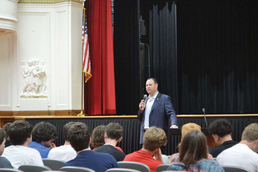 WVU Athletic Director Wren Baker speaks to a group of Parkersburg High School students Wednesday for their Sports In American Culture class. (Photo by Douglass Huxley)