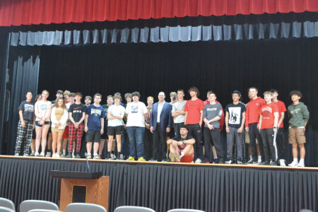 WVU Athletic Director Wren Baker, center, poses for a picture with Parkersburg High School students after speaking to them in the school auditorium for their Sports In American Culture class. (Photo by Douglass Huxley)