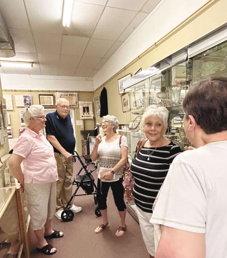 Reba Starner, former Belpre Mayor Bill McAfee, Judy Frum and Becky Copen compare notes and greet an additional visitor to the Underground Railroad Exhibit Room at The Farmer’s Castle Museum open house Saturday, commemorating the local history and significance of Juneteenth. The federal holiday is today. It has been a national observance since 2021, but has been celebrated within the Black community since 1866. (Photo by Nancy Taylor)