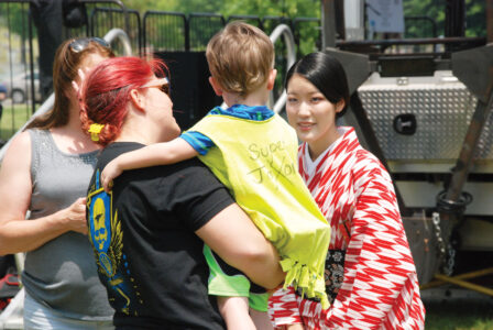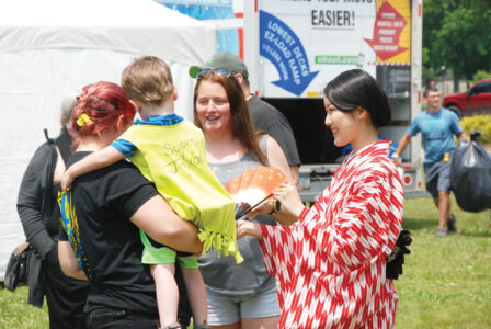 - Incoming Marietta College sophomore Kanae Yoshida, right, of Japan, interacts with a young Mid-Ohio Valley Multi-Cultural Festival attendee after her performance of a Japanese dance Sunday afternoon at Parkersburg City Park. (Photo by Evan Bevins)