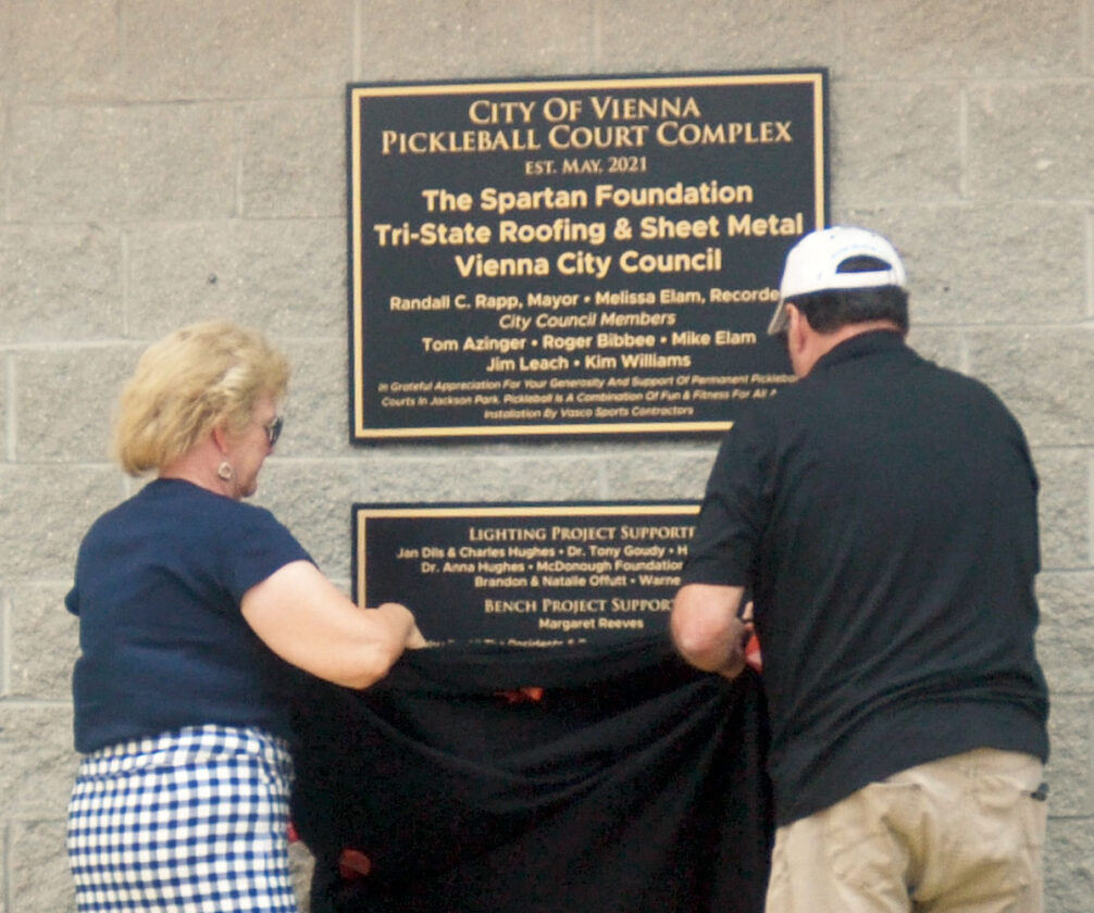 - Linda Kern, Senior Center Director, and Steve Black, Park Department Director, reveal the commemorative plaques at the pickleball courts in Jackson Park Friday. (Photo by Kristen Hainkel)
