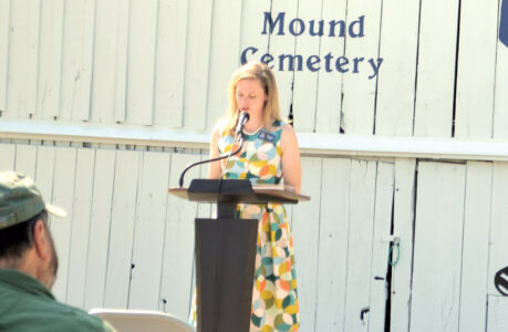 Megan Wood, Executive Director and CEO of Ohio History, talks about the importance of the barn dedication as it relates to history and preservation. “It is an effort to use local historical buildings to tell local history,” said Wood. (Photo by Clara Noelle)