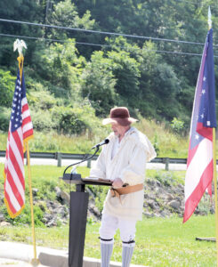 - Scott Britton, historian for the Sons of the American Revolution and Executive Director of the Marietta Castle Museum, speaks at the Barn dedication on Wednesday. Britton spoke on Commodore Abraham Whipple’s past. Whipple was one of Marietta’s founders as well as a Navy officer in the American Revolution as an American soldier; he also served in the French and Indian War as a British soldier. The name of a community in Lower Salem, Whipple, was named after Whipple Run. Whipple Run, a nearby stream, was named after the late commodore after he fell in said creek. (Photo by Clara Noelle)