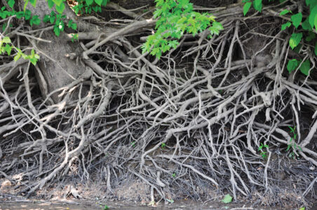 - The maze of tree roots exposed by passing flood waters. (Photo by Art Smith)