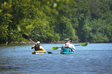 - A pair of kayakers head up the south side of the island. (Photo by Art Smith)