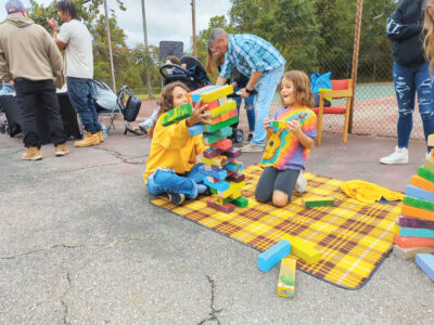 - Parkersburg resident Zakiya Powell, 8, reacts as sister Amiya Powell, 14, catches a tower of blocks about to topple as they enjoy an oversized game of Jenga during the Harvest the Vision event Sunday afternoon at the Boys & Girls Club of Parkersburg. (Photo by Evan Bevins)