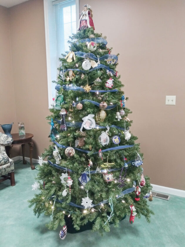 Within the Parkersburg Area Community Foundation are Christmas trees decorated with ornaments to represent individuals or family members of individuals who have started funds or legacy funds with the Foundation. (Photo by Gretchen Dowler)
