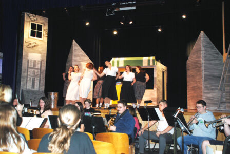 - The “Do Wop Girls” – Ali Evans, Keilan Jagdmann, Lillian Kelbaugh, Zoe Koskey, Haylee Reynolds, Kaelynn Seebaugh and McKena Cunningham – rehearse the opening number for Parkersburg South High School’s theater production of “Little Shop of Horrors.” The show opens at 5 p.m. Saturday with dinner catered by Outback Steakhouse. (Photo by Douglass Huxley)