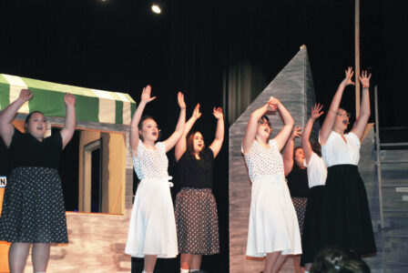 - The “Do Wop Girls” – Ali Evans, Keilan Jagdmann, Lillian Kelbaugh, Zoe Koskey, Haylee Reynolds, Kaelynn Seebaugh and McKena Cunningham – rehearse a musical number Wednesday as Parkersburg South High School’s theater troupe gears up for their opening of “Little Shop of Horrors” at 5 p.m. Saturday. (Photo by Douglass Huxley)