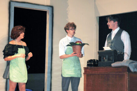 - Lily Rice (Audrey), Jantzen Karcher (Seymour) and Caleb Rowan (Mr. Mushnik) rehearse a scene Wednesday night as Parkersburg South High School’s theater troupe gears up for their opening of “Little Shop of Horrors” at 5 p.m. Saturday. (Photo by Douglass Huxley)