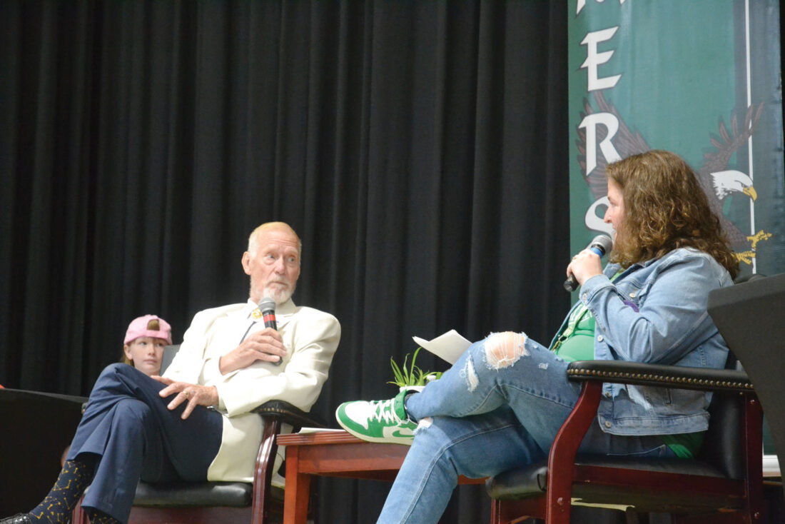 Former Emerson Elementary Principal James Bredon talked to current principal Tabatha Efaw during a Q&A Wednesday as the school prepared to open a time capsule from 1994. Bredon talked about his time as a principal that year and the many more he had at the elementary. (Photo by Douglass Huxley)