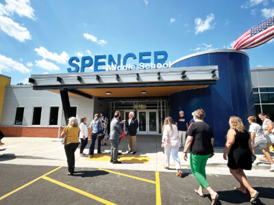 A ribbon cutting ceremony and community open house were held for the new $20 million Spencer Middle School Wednesday, along with a “pup rally” to celebrate the new school and introduce Friends With Paws therapy dog Flora, a golden retriever, who will be located at the new school.