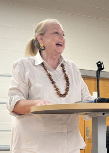 West Virginia First Lady Cathy Justice speaks during a pup rally Wednesday to introduce the 34th Friends With Paws therapy dog, Flora, who will be placed at the new Spencer Middle School. (Photo by Michelle Dillon)