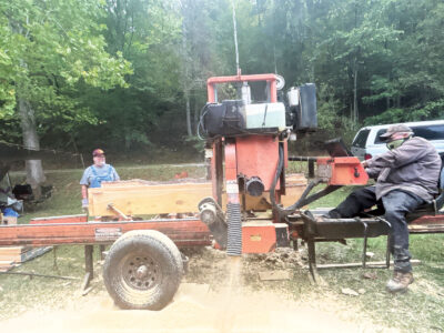 Jeff Kennon and Earl Hudkins, both members of the Wood County Flywheelers, demonstrated how Kennon’s antique saw mill worked Friday night. Kennon comes every year with his saw mill, which can cut about 250 board feet an hour, he said.