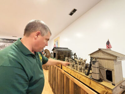 Wood County Parks Director Jeremy Cross shows off a model of an endless cable system at the Volcano Museum at Mountwood Park Friday as part of Volcano Days. This type of system was first used in Volcano and it allowed up to 40 oil wells to be operated at one time. (Photo by Michelle Dillon)