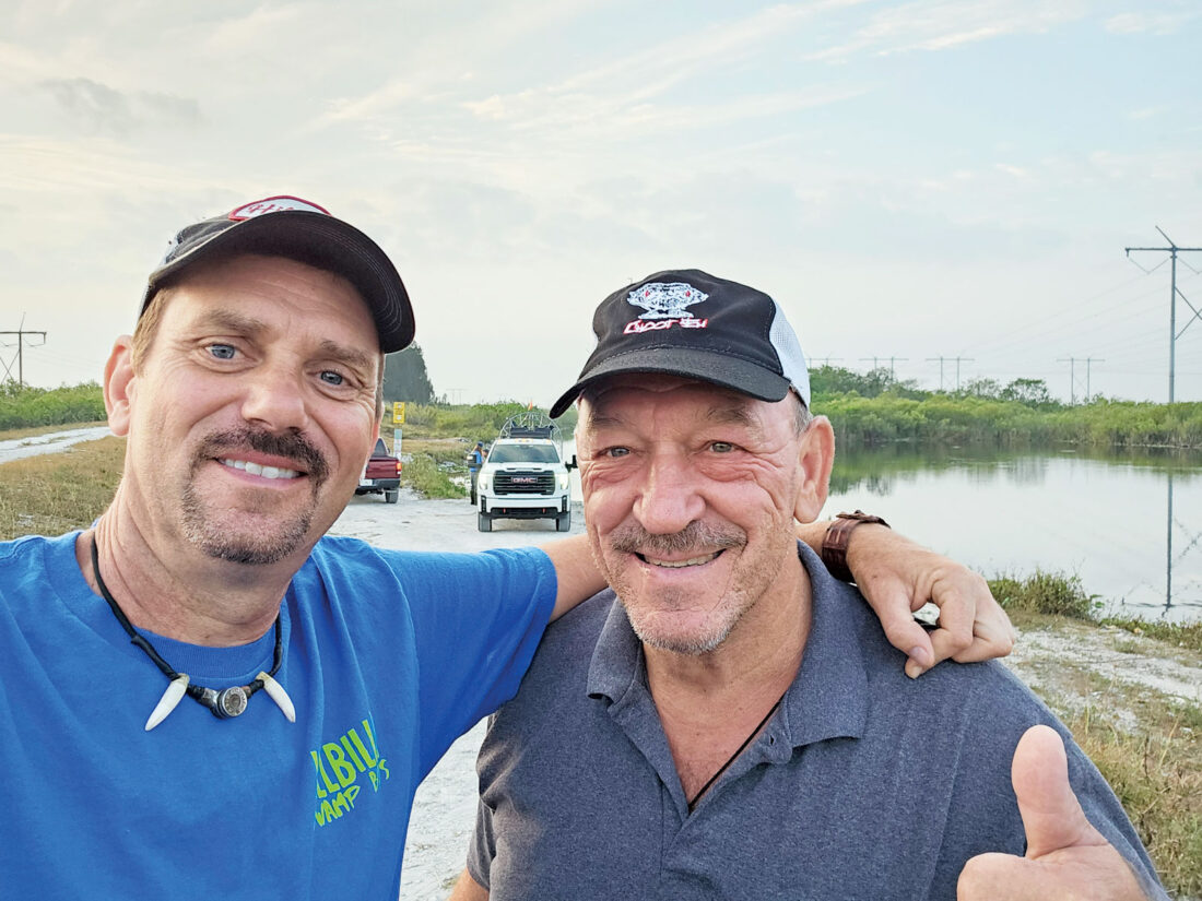 Dave Hackathorn, left, and Troy “King of the Swamp” Landry during the filming of Season 5 of the premiere of “Swamp People: Serpent Invasion” in May in the Florida Everglades. The show airs 9:30 p.m. Jan. 2. Hackathorn is known as Hillbilly Dave. (Photo Provided)