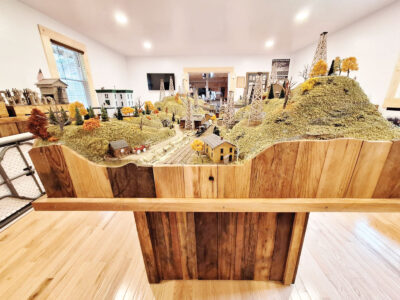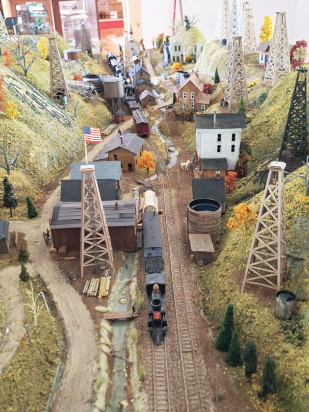 Bee says 678 hours were required to build the large model, working on it nearly every day over the past three months. He was assisted by fellow Mid-Ohio Valley Model Railroad Club members Doug Unsold, Kelly Offenberger, Christian Offenberger, Roy Highman and Tom Ratkovich. Unsold modeled some structures and the wagons, while the Offenberger father and son duo worked on scenery and trains. Meanwhile, Highman crafted a live edge out of wood harvested from actual oil tanks and barrels at Volcano and Ratkovich contributed train cars and research materials. Additionally, Bill Edwards and his maintenance team at Mountwood Park built the base out of wood from former oil tanks and barrels.