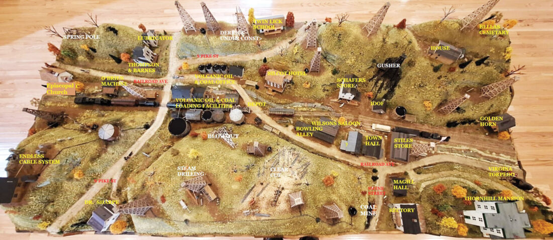 Thanks to the efforts of local modeler Jimmie Bee of Parkersburg, the oil well operations and town of Volcano, captured in 1/87 (HO) scale, will soon be available for public viewing at the Volcano Museum in the Mountwood Park Visitors Center.