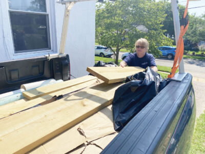 - Amanda Deems of Highmark loads wood into a pickup truck Friday at a job site on Plum Street in Parkersburg. A group of six women from Highmark helped with work on a Habitat For Humanity house build Friday as part of the United Way of the Mid-Ohio Valley’s annual Day of Action where volunteers did work around the community. (Photo by Brett Dunlap)