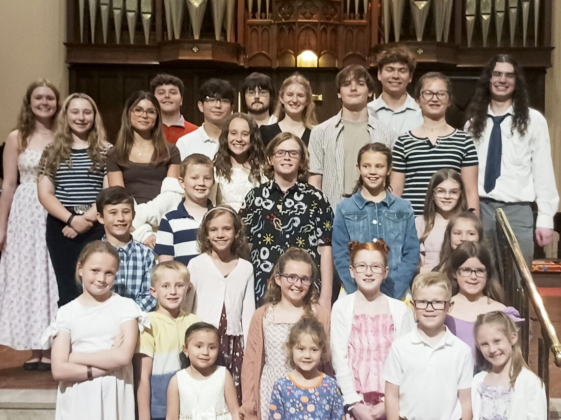Piano students of Stephanie Robinson were featured in a piano recital on May 30 at First Lutheran Church. Students participating were, first row, from left, Katelyn Rose Flinn, Kaylynn Cunningham, Luke Goldsberry, Emmalynn Dubs. Second row, Lucy Wright, Bayne Nutter, Abi Mcbride, Millie Smith, Brooke Sims. Third row, Ben Davis, Zeke McCrady, Violet Hofmann, Lennon McBride, Eliza Boot, Haven Pickens, Emma Whited. Fourth row, Lorelei Dent, Kelli McKinney, Nathan Thornton, Mia Nesselroad, Maddie Dunlap, Brayden Stephens, Payton Colvin. Fifth row, Ava Branham, Rogan Easton, Dylan Roberts, Connor Roberts, Andrew Brock. Senior award went to Connor Roberts. Bach Award to Ben Davis. Beethoven Award to Emma Whited. Special guest was Nathan Thornton. Not pictured were Peyton Easton, Christian Rozzetti, Logan Sims and Sophia Wigal. (Photo Provided)