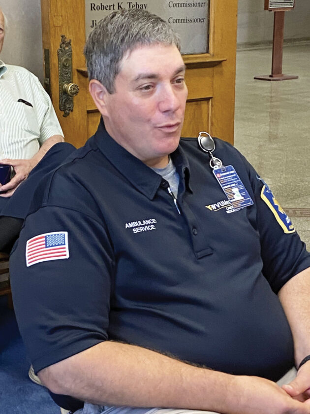 Shawn Marshall, manager of EMS Services at WVU Medicine Camden Clark Medical Center, appeared before the Wood County Commission on Monday to give an update on how ambulance service has been going since the closure of St. Joseph’s Ambulance Service at the end of March. (Photo by Brett Dunlap)
