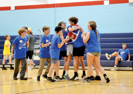 - Blennerhassett Middle School students representing Great Britain celebrate winning gold in the Soccer Stars event Friday during the school’s Olympic events. (Photo by Douglass Huxley)