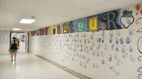 Students at Van Devender Middle School used paint to leave their handprints on the wall of a hallway during the school’s Olympic events Friday. The school is scheduled to close after this year. (Photo by Douglass Huxley)