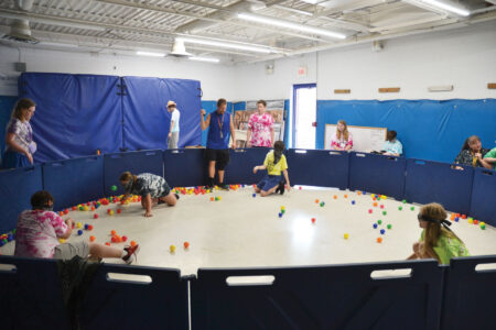 - Students at Van Devender Middle School played a game of Human Submarine Friday during the school’s final Olympic events. Students worked in pairs where one was blindfolded in the pit with the other giving directions from outside the ring to “hit and sink” other submarines. (Photo by Douglass Huxley)