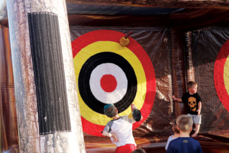 - Owen Whited prepares to toss a toy axe at a target in the kids’ inflatable zone during the Glow on the O Festival in Vienna on Saturday. (Photo by Gwen Sour)