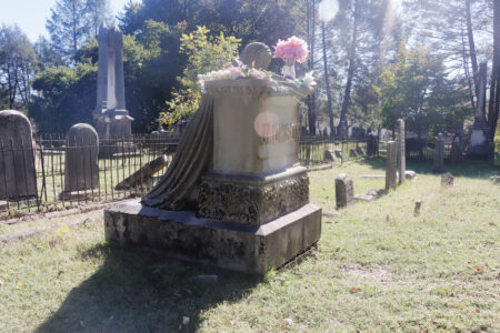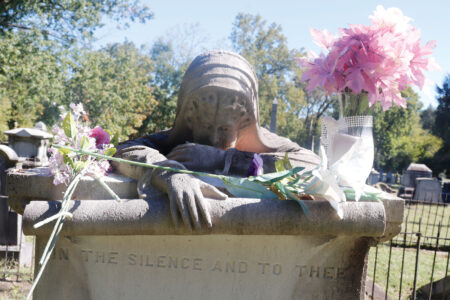 - Admirers of the Riverview Cemetery’s Weeping Woman leave flowers to honor the alleged spirit. (Photo by Gwen Sour)