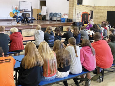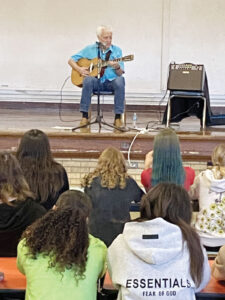 Blues musician/educator Doug MacLeod of Memphis, Tenn., an internationally known blues musician with 26 albums to his credit, performed Friday for the students at Belpre Middle School as part of the Blues in the Schools program. MacLeod talked to the students about the history of Blues music and its historical significance and the impact it has had on American music. He also brought a message of the healing power of music to overcome his life story of childhood abuse and stuttering. (Photo by Brett Dunlap)