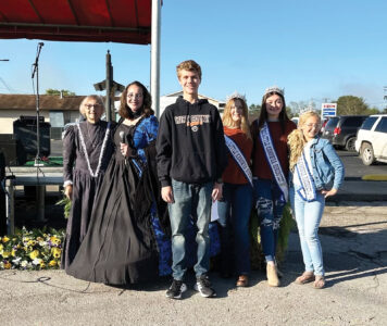 The 2024 essay contest winner, Lucas Curfman, center, is pictured with Daughters of American Pioneers members and Riverfest royalty after winning the 2024 Pioneer Days essay contest. (Photo Provided)