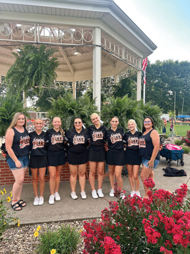 - Bella Morrison, third from left, and the Belpre High School cheer team are seen before they performed for Belpre Homecoming at Civitan Park on Aug. 1. Coaches Rachel Thomas, left, and Lindsay Taylor, right, led the team. (Photo Provided)