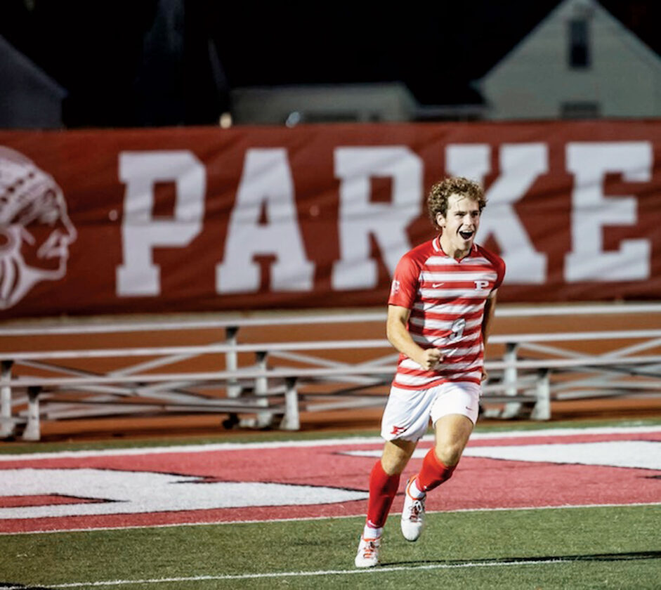 - Landen Deuley, a senior at Parkersburg High School, on the soccer field after scoring a goal in his position as striker. (Photo Provided)
