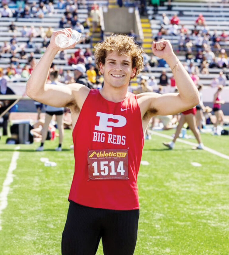 - Landen Deuley, a senior at Parkersburg High School, raises his arms in victory after winning a state championship in the 400-meter race as part of the PHS Track team. (Photo Provided)