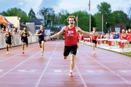 Landen Deuley, a senior at Parkersburg High School, raises his arms in victory after winning a state championship in the 400-meter race as part of the PHS Track team. (Photo Provided)