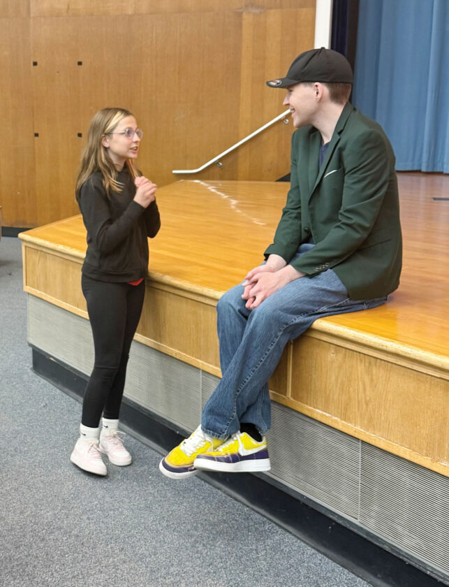 Seventh-grader Cady Williamson speaks to Dr. Kerry Magro, autistic professional speaker, author and autism consultant, at Blennerhassett Middle School on Wednesday during the district’s Voices of Inclusion Speaker Series. (Photo Provided)