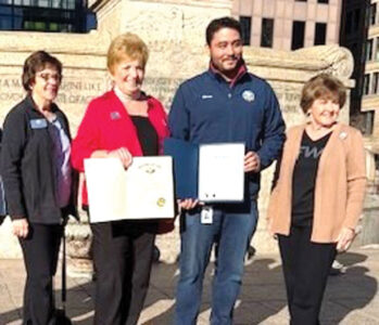 - From left, Great Lakes Region GFWC President-elect Wendy Carriker, Great Lakes Region President Rose Logston, Karl Mason representing the Ohio Secretary of State and International President Suellen Brazil and International President Suellen Brazil on the steps of the statehouse in Columbus where the annual conference of the Great Lakes Region included a tour. (Photo Provided)