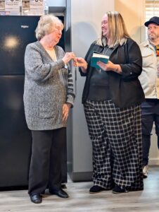 Habitat for Humanity of the Mid-Ohio Valley board member Carolyn Garrity presents Alisa Pisula with the keys to her new house as Pisula holds a Bible given to her by Garrity and the organization Sunday at the house in Parkersburg. (Photo by Evan Bevins)